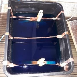 Ванну полностью переделал — использовал черную ванну для строительных работ, купил в Кипсе за 1.5 евро. Штанги из полосок (вырезал из медной трубы), кабели просто припаял к штангам, другие концы на соединитель от блока.